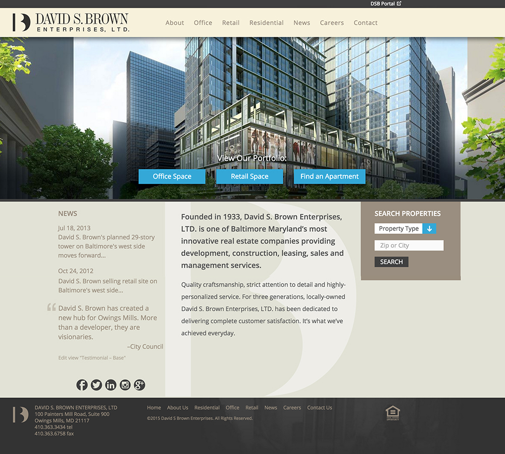 METRO CENTRE David S. Brown is the developer for Metro Centre. They provide development, construction, leasing, sales and management services. They needed their site to speak to 3 audiences. Off the home page we jump the user into Office Space, Retail Space, and Apartment. Adds for Metro Centre jump directly here for Residential, Office & Retail. |