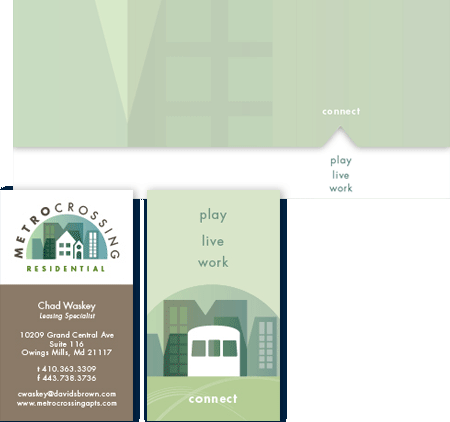 The apartments used the residential logo and tie in the tagline: play, live, work... connect. The triangle die cut helps to play off the connect theme.